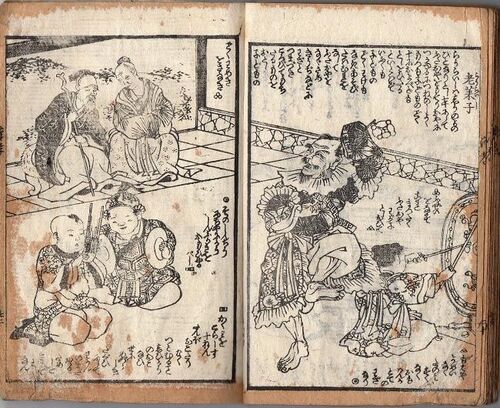 老らい子は周の世の人なり。歳七十にして二親を持てり。親に仕ゆるに常の食物も子供の如く{十に及べども}年老ひたると厭はず。 衣服も子供の如く、わけも無き遊び戯れをなして二親を慰め{きうぢ}などにわざと躓き転びて持ちたるものを落とし子供の如くわ…