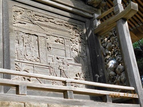 さて玉垣は一回りしたので、本殿の胴羽目板の彫刻を見てみましょう。これは漢文帝ですね。玉垣と比べると面積が広いので人物や背景の表現にも余裕があります。でもパッと見たとき一瞬「あれ?」と思いました。玉垣の彫刻が二十四孝メインだったので、羽目板…