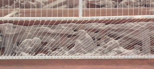 老莱子。右の二人が年老いた両親、左で泣いているのが老莱子。 ヒラヒラした服を着て踊っている彫刻が多い老莱子ですが、ここの老莱子は子供のように両足を投げ出して泣いています。 老莱子が泣いている理由は・・・。 「・・・又親のために給仕をするとて、…