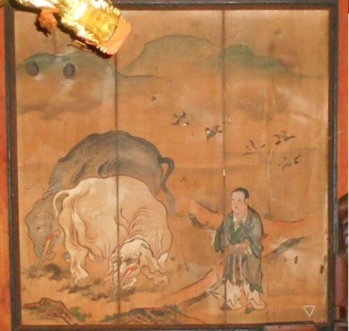 象と鳥と少年。この絵は大舜。 彫刻では地面を踏んでいる象の図が多かったですが、この絵の象たちは牙で器用に耕しています。 心強い協力者がいて、大舜は鍬を持つ手をしばし休めて一息ついてます。