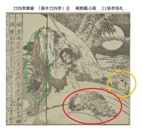2019/10/04に「三嶋大社・17 仲由」として投稿した記事に関して、「張孝兄弟」に訂正いたしましたことをご報告いたします。 文政2年発行の「二十四孝図会 葛飾戴斗画」の中に、この彫刻とそっくりな絵がありました。 The British Museumのデータベースから画…