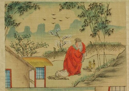 孟宗です。吹雪の山中で筍を探すイメージの強い孟宗ですが、この絵では庭先のようです。雪もなく、暖かそうな日和に見えます。 画像は早稲田大学図書館古典籍総合データベースより Crying before bamboo and the Growing of ShootsMeng Tsung of the Chin dy…