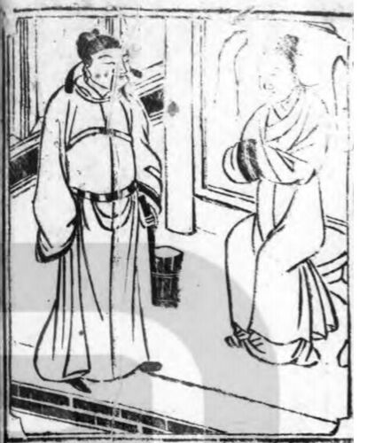 いよいよラスト。黄庭堅。この構図には既視感が。 これですね。19の姜詩。床下浸水中。 黄庭堅(左の絵)の母親は病床にいるはずなのですが、この絵の母親はシャンシャンしてそうに見えます。 中国国家図書館•中国国家デジタル図書館ウェブサイトより 〇滌親…