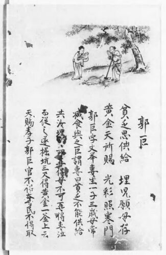 郭巨。郭居敬の本「全相二十四孝詩選」では失われていた郭巨。 国立国会図書館デジタルコレクションより 「黄金一釜」はインゴットや中国の昔の通貨ではなく、釜で描かれてますね。 国立国会図書館デジタルコレクションより 郭巨貧乏思供給 埋児願母存黄金天…