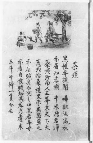 桑の実を母の分と自分の分、二つに分けて収穫していたことで幸運を招いた蔡順。カゴ二つ、お米、牛の肉、盗賊と手下のフルコンボ。手下は「本当にこれあげちゃうんですか?」と盗賊の頭に目で訴えているよう。 国立国会図書館デジタルコレクションより 蔡順…