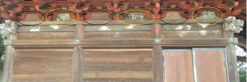 本堂正面右から三番目の大舜を先頭に、時計回りでご紹介しています。本堂左側の面は彫刻が一つ置きに欠損していました。残念ですね。 左面一番右の彫刻がこちら。 盗賊と正座している男性の間にカゴが二つ。蔡順ですね。 赤丸の中の二つのカゴはわかりますが…
