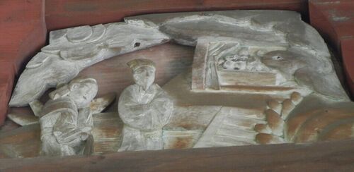 本堂背面の彫刻は6点のうち一つが欠損していました(黄色丸部分)。右端の彫刻から見ていきます。 タイトルのすぐわかる彫刻はありがたいです。こちらはわかりやすいですね。丁蘭。 木像を針でつついて祟りにあった奥さん。 二つ並んだ両親の木像。左がお父…
