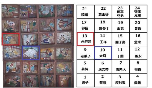 大舜の左上は朱寿昌。 生き別れの母親を探し、ついに巡り合えた朱寿昌母子。 意外と恰幅の良いお母さんでしたー。