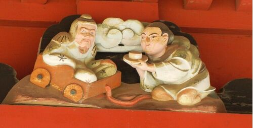 小さな車に乗った高齢男性と、何か食べ物を捧げる若い男性。 この絵柄、私は初めて見ましたが、これは董永だと思われます。 董永と言えば、借金返済を手伝ってくれた後、天に帰る織姫を董永が見送るシーンが多いですね。 稲敷市大杉神社の董永。綺麗な雲に乗…