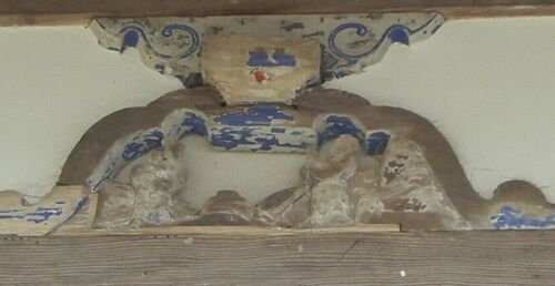 右側中央の彫刻は郭巨。 右側の男性は両手を合わせて天に感謝を捧げています。左の女性は幼児を抱いています。 中央には郭巨の鍬と、土中から出てきた黄金の釜。 釜が蓋付きの丼みたい。