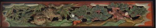 虎から父を守る楊香。虎の左の板には「楊香」って書いてあったんでしょうねえ。 お父さんの右手は欠損しているのかな?手のひら部分が見当たらないですね。 漢土二十四孝の楊香。