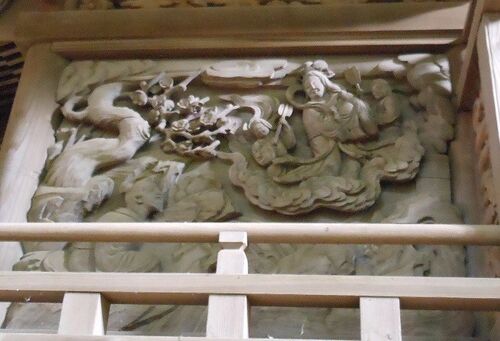 正座して織姫一行を見送る董永。織姫も名残惜しそうです。ここの「董永」の彫刻はとても立体的に見えて好き。 こちらは先日ご紹介した日立市 船見山天満宮の董永。人物の配置はほぼ同じですね。左下に董永、右側に雲に乗る織姫、両脇に侍女。 船見山天満宮の…