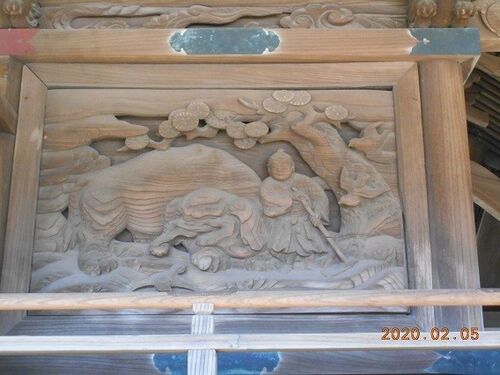 本殿の周囲には柵がめぐらされてます。 背面の胴羽目には彫刻はありませんでした。左右の胴羽目に二十四孝の彫刻が一枚ずつありました。 楊香。 一生懸命両手を広げて父親を守る楊香。 でもお父さん笑ってるみたい・・・。