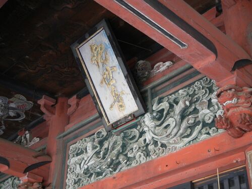 滑河観音の本堂。 本堂の階段を上り、まず見上げる一番良い位置には額があります。中央に白っぽい「滑河山」の扁額。その右側には坂東二十八番御詠歌の額。 この滑河山の額の後ろにも二十四孝の彫刻が隠れています。センター位置なのに、すこぶる見にくい場…