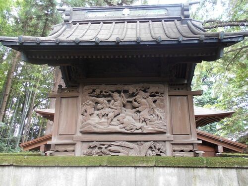 背面には、二十四孝ではなく「韓信の股くぐり」の彫刻がありました。 ごつい男の人が袴の裾を持ち上げています。這いつくばって潜り抜けようとする韓信。魚籠の前に立つ人は韓信を指さして「情けない男だ」と嘲っているところでしょうか。 こちらは秩父・三…