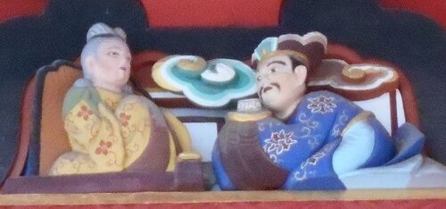 ひな壇みたいなところに飾られた、たぶん母親をかたどった小さな木像。これは「丁蘭」ですね。 丁蘭がお供え物を捧げているところでしょうか。